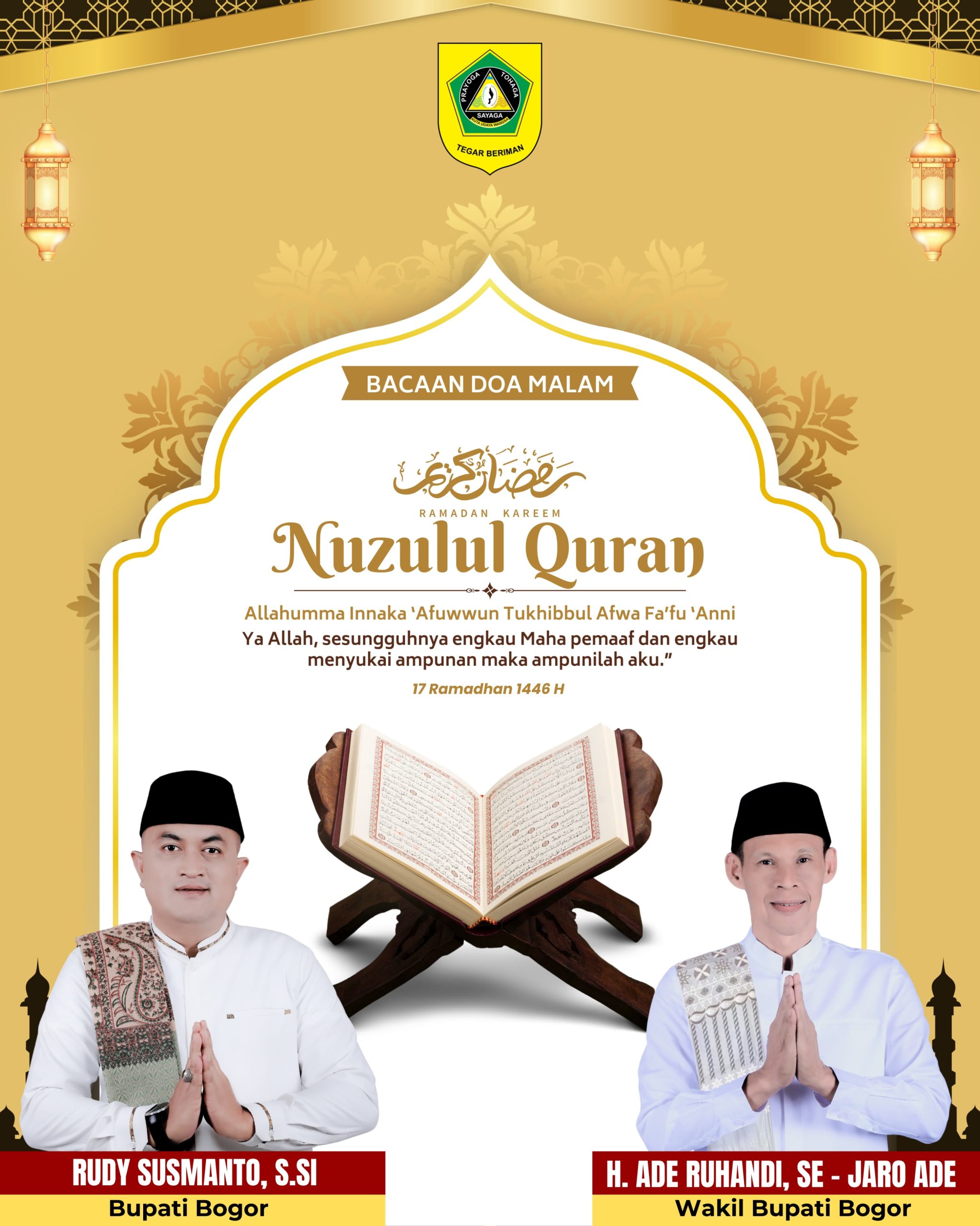 Kami, Bupati dan Wakil Bupati Bogor periode 2025–2030, dengan penuh rasa syukur, mengajak kepada seluruh warga Kabupaten Bogor untuk memperingati Malam Nuzulul Qur’an 17 Ramadhan 1446 H.