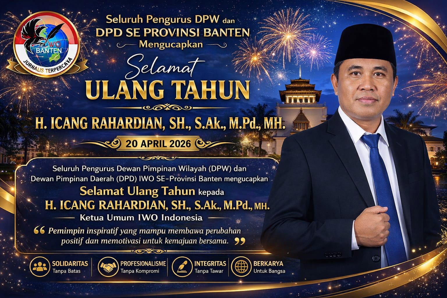 “Kami mewakili keluarga besar Ketua DPD IWO Indonesia se-Jawa Barat mengucapkan selamat ulang tahun kepada Bapak Dr. NR. Icang Rahardian. Semoga senantiasa diberikan kesehatan, umur panjang, kekuatan, keberkahan, serta kesuksesan dalam memimpin organisasi yang kita cintai bersama,” ujar Syuhada, Senin (20/4/2026).