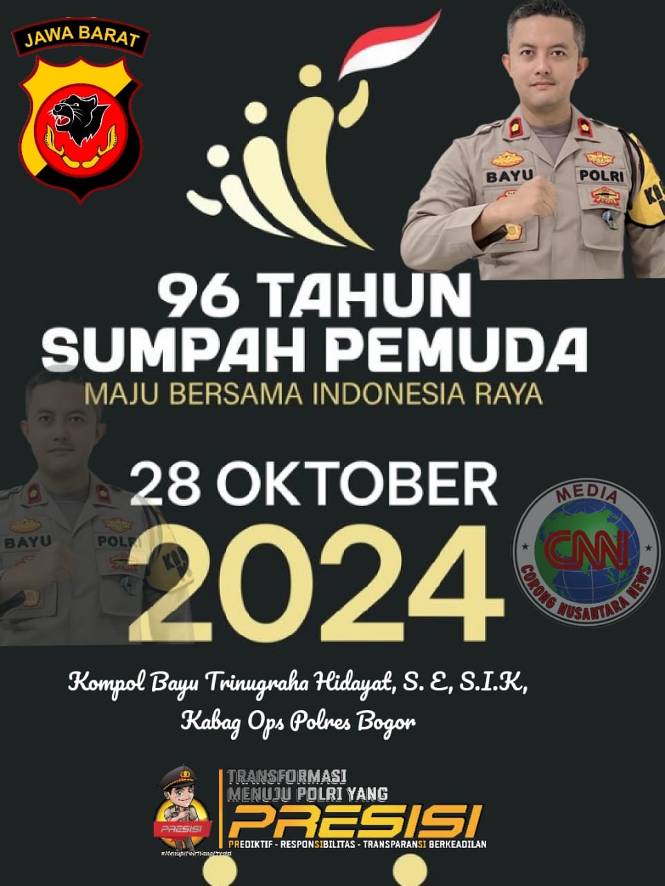 CorongNusantaraNews.com — Cibinong — Kabag Ops Polres Bogor, Kompol Bayu Trinugraha Hidayat, SE,.S.I.K,.MM Mengucapkan Selamat Hari Sumpah Pemuda Ke-96 Tahun 2024.