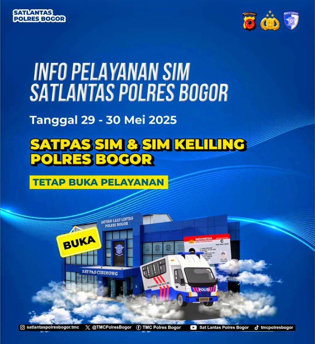 CorongNusantaraNews.com — Polres Bogor — Selama libur atau cuti bersama Memperingati Hari Kenaikan Isa Almasih pada Tanggal 29-30 Mei 2025, Satuan Penyelenggara Administrasi Surat Ijin Mengemudi (Satpas) Cibinong dan SIM Keliling Satlantas Polres Bogor, tetap buka melayani pembuatan dan perpanjangan masa berlaku SIM.