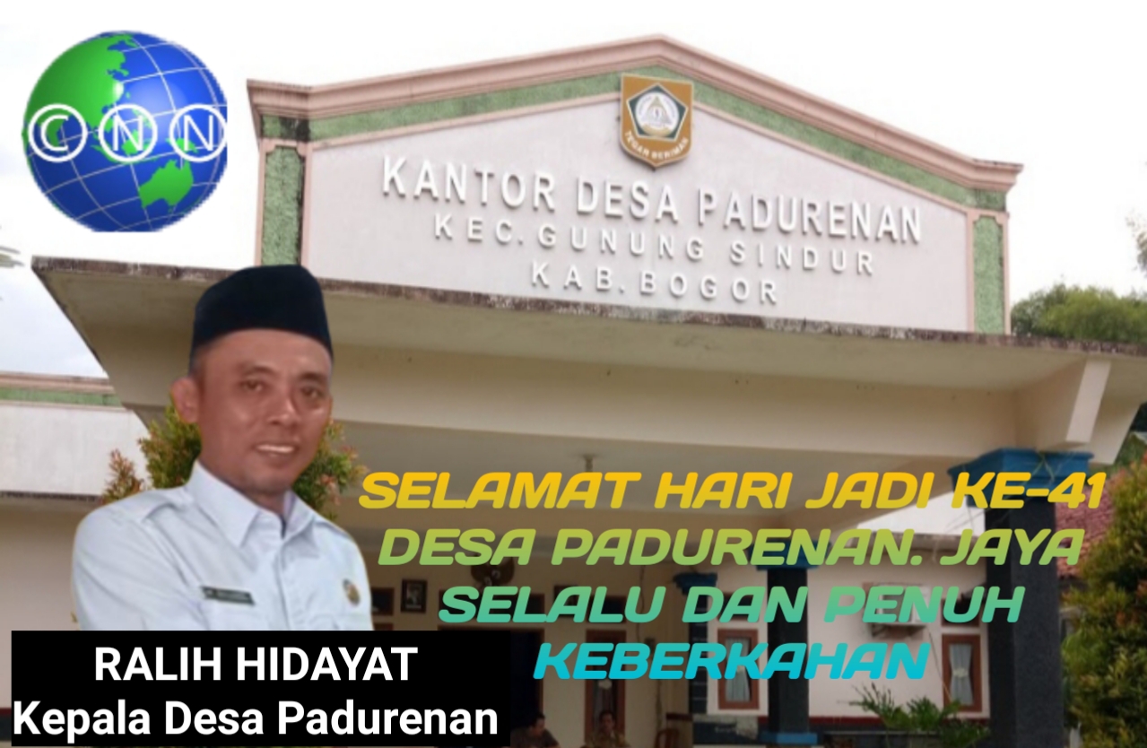CorongNusantaraNews.com — Cibinong — Pimpinan serta staff dan jajaran media CNN mengucapkan “Selamat Hari Jadi ke 41 tahun Desa Padurenan tumbuh dan berkembang bersama warganya. Semoga di usia yang semakin matang ini, Desa Padurenan terus menjadi ruang yang aman, produktif, dan membawa harapan baru bagi generasi mendatang”.