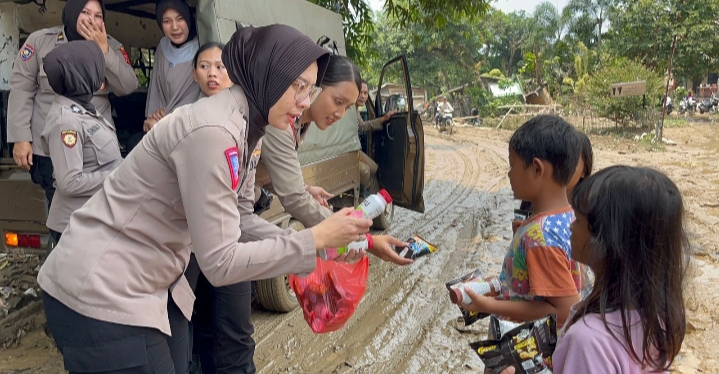 Polwan Polres Bogor Giat Evakuasi Serta Pendampingan Trauma Healing Terhadap Korban Musibah Banjir Bandang Di Bojong Kulur